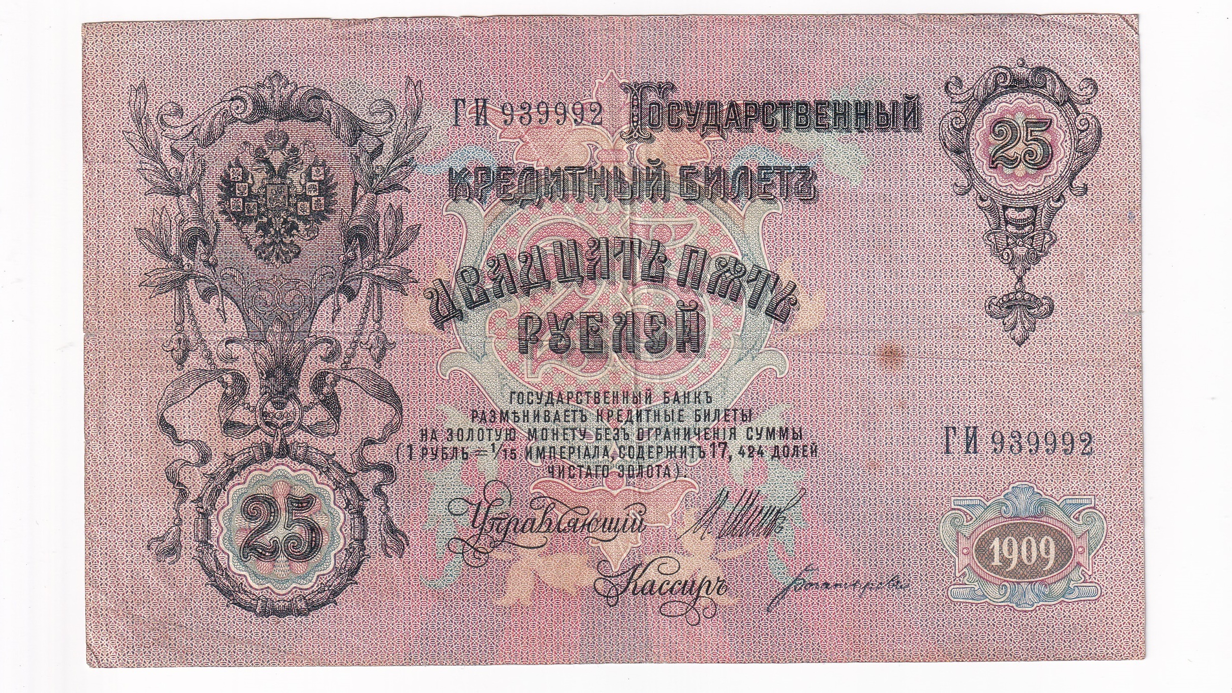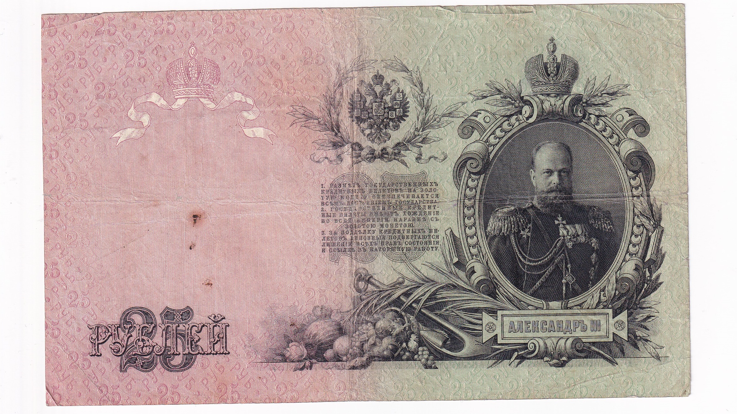 Stará, obehová bankovka Ruska v hodnote 25 Rubľov z roku 1909.
