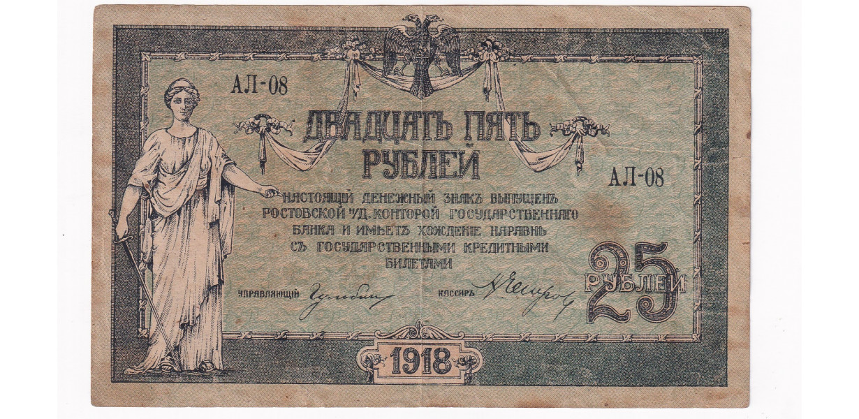 Rusko 25 Rubľov 1918, séria 08, Južné Rusko, Stará, obehová bankovka Ruska v