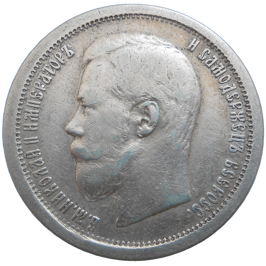 Stará, strieborná, obehová minca Ruska v hodnote 50 kopejky z roku 1896.
