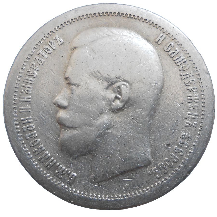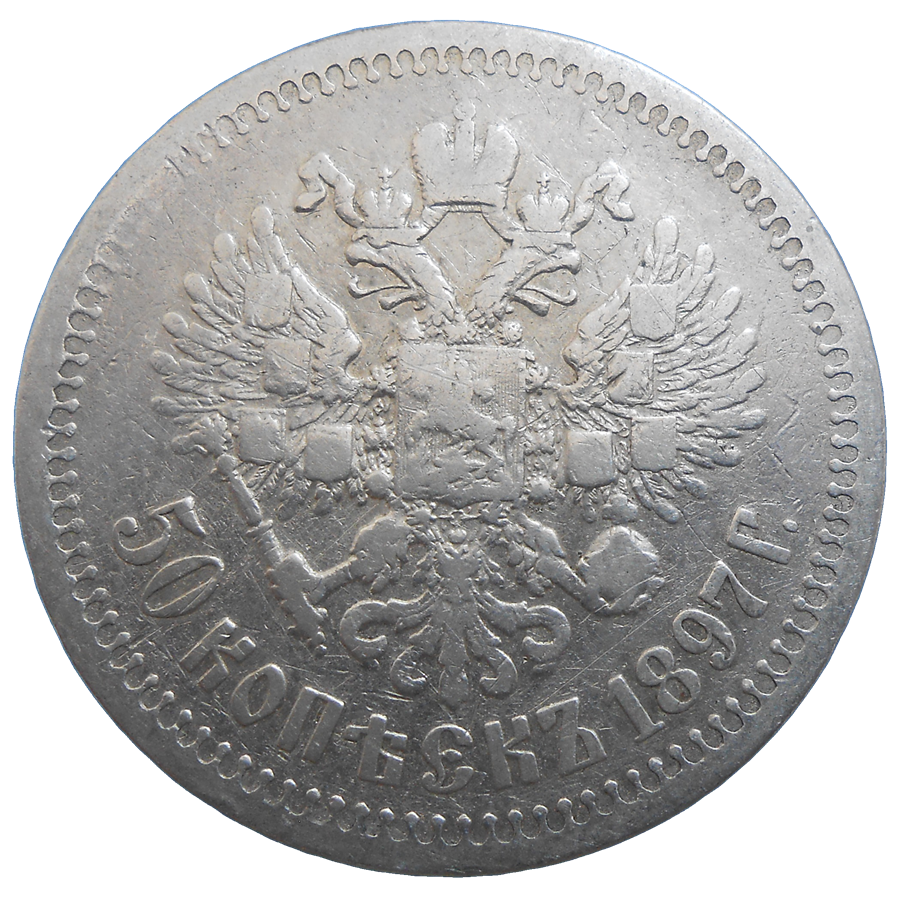 Stará, strieborná, obehová minca Ruska v hodnote 50 kopejky z roku 1897.