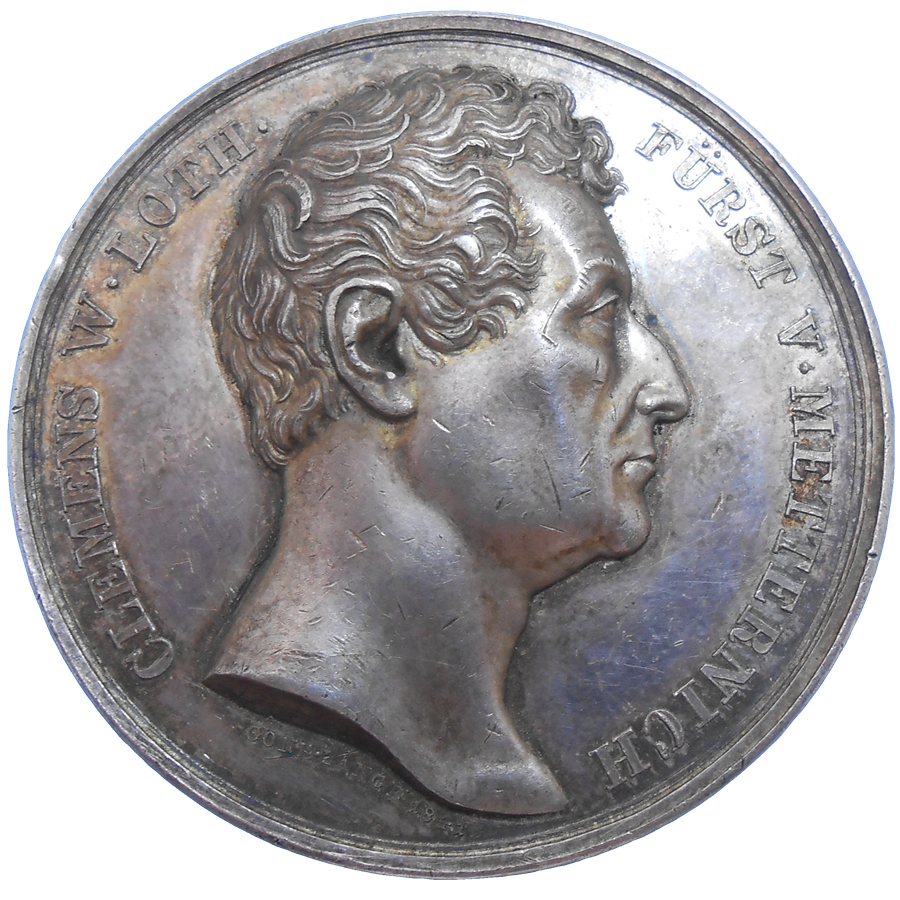 Portrétna, strieborná medaila kancelára Metternicha vydaná v roku 1841.