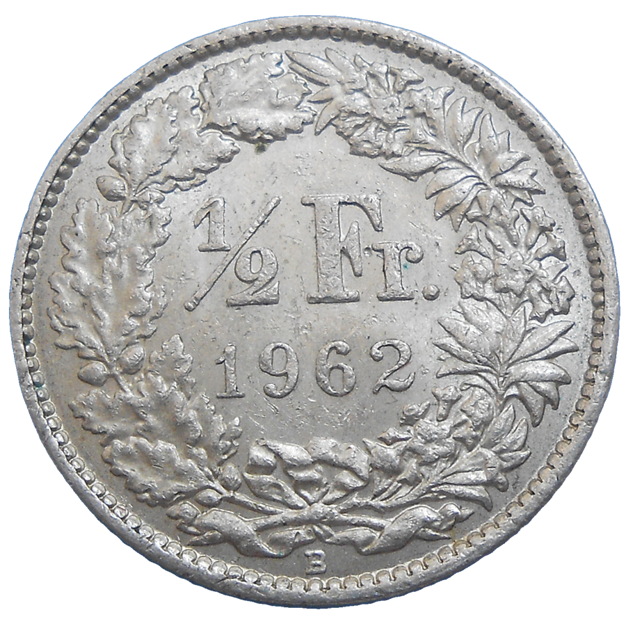 Švajčiarsko 1/2 Frank 1962 B. Stará, strieborná, obehová minca Švajčiarska v hodnote 1/2 Franku z roku 1962 – Numizmatický obchod
