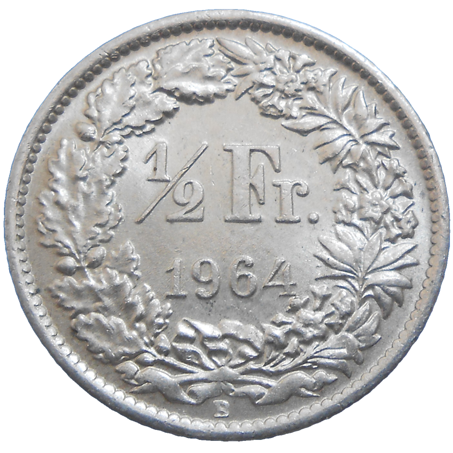 Stará, strieborná, obehová minca Švajčiarska v hodnote 1/2 Franku z roku 1964.
