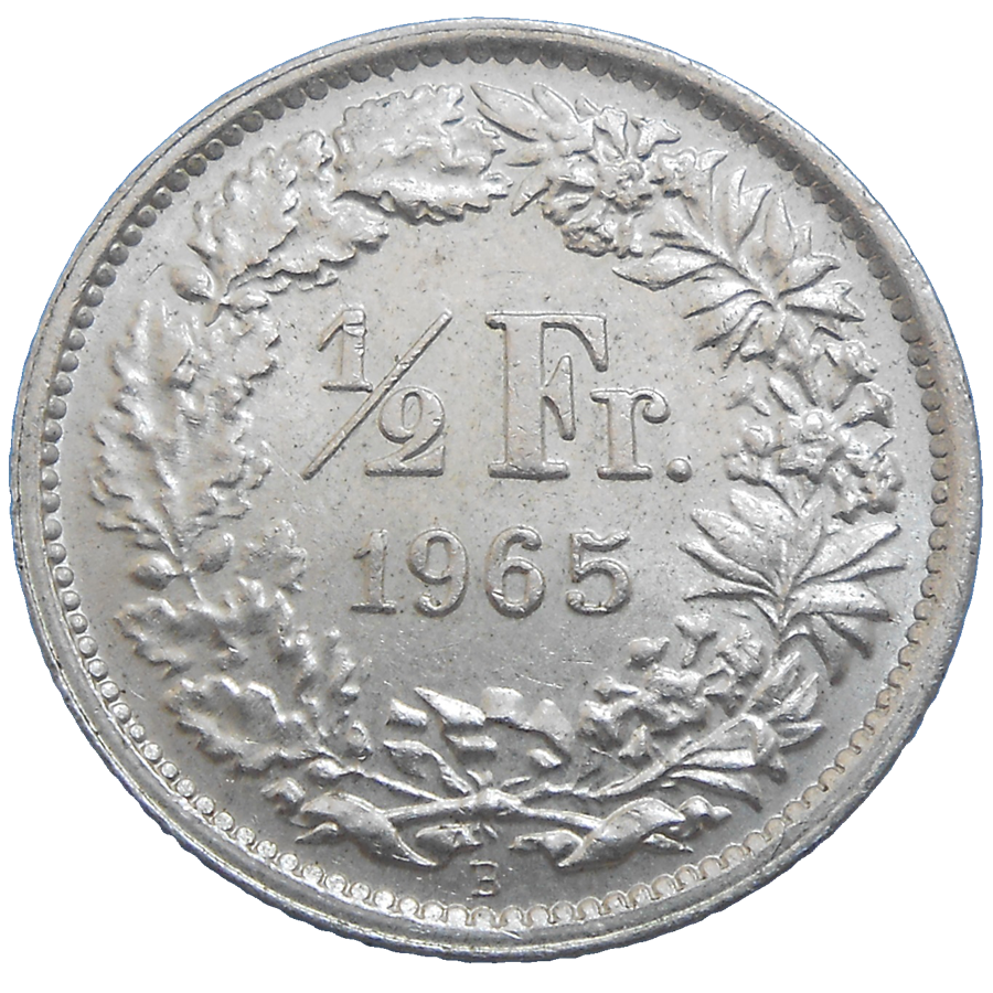 Švajčiarsko 1/2 Frank 1965 B. Stará, strieborná, obehová minca Švajčiarska v hodnote 1/2 Franku z roku 1965 – Numizmatický obchod