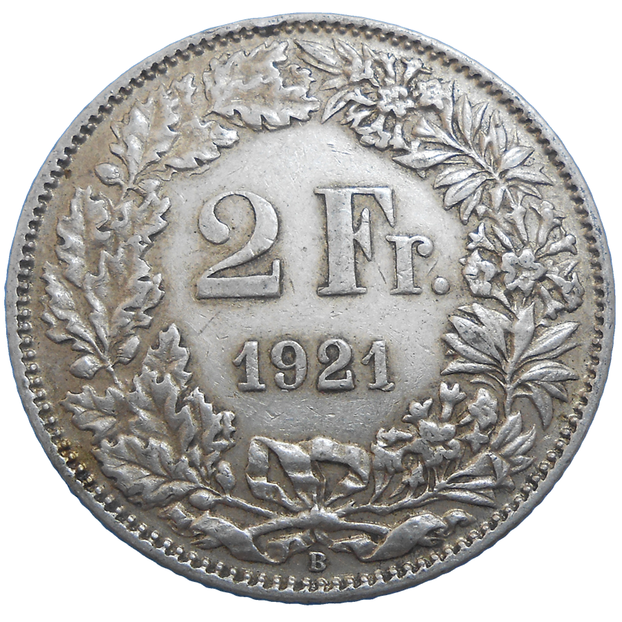 Švajčiarsko 2 Frank 1921 B. Stará, strieborná, obehová minca Švajčiarska v hodnote 2 Franku z roku 1921 – Numizmatický obchod