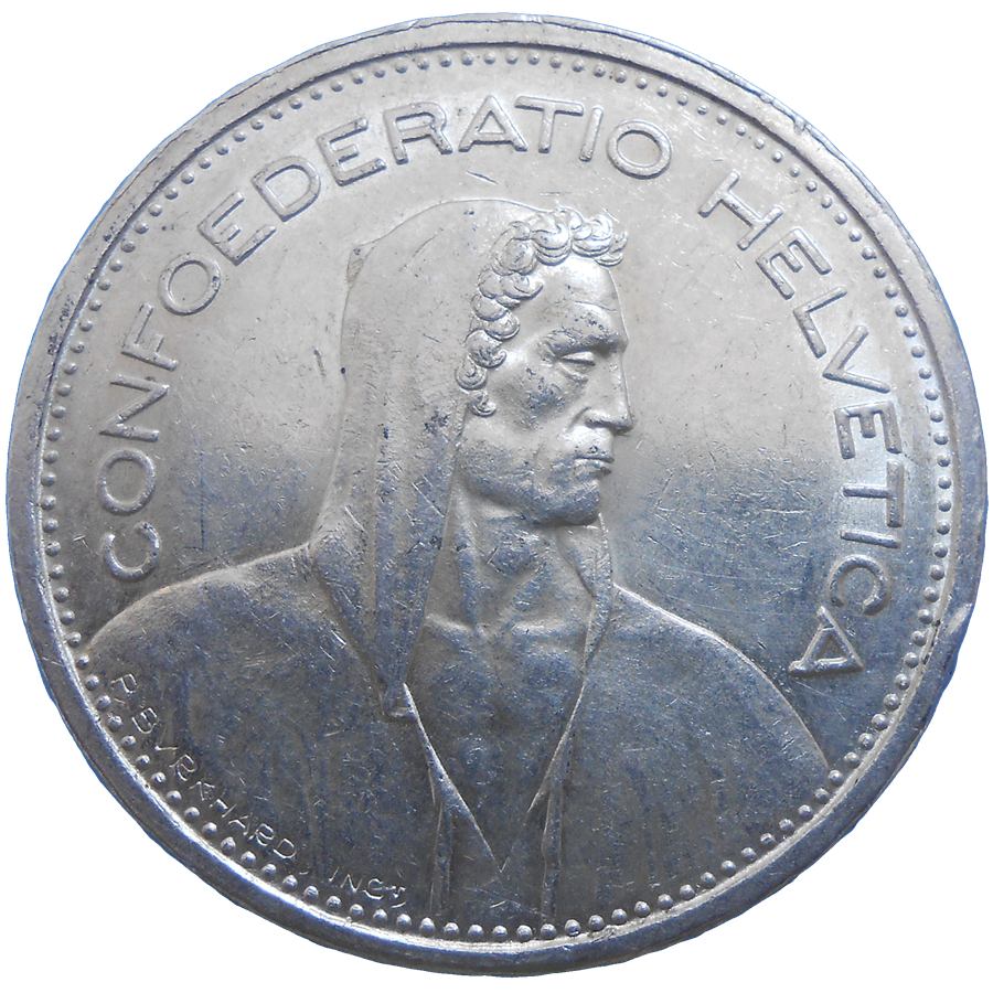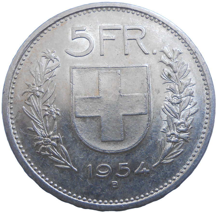 Stará, strieborná, obehová minca Švajčiarska v hodnote 5 Franku z roku 1954.