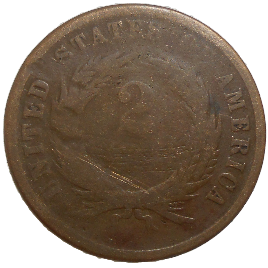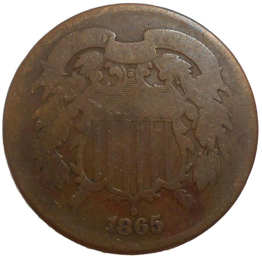 Stará, bronzová, obehová minca Spojených Štátov Amerických v hodnote 2 centov z roku 1865.